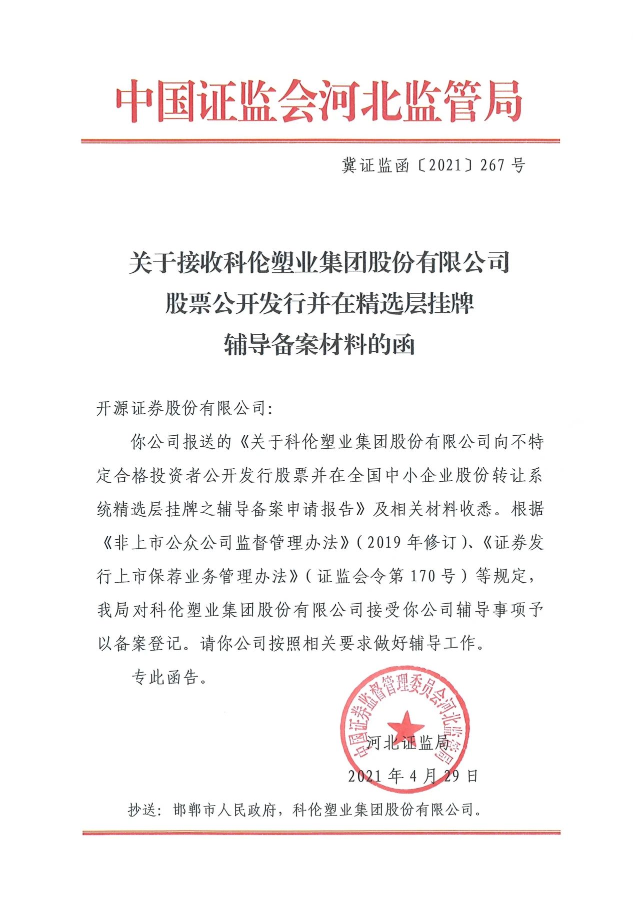 中國(guó)證監(jiān)會(huì)河北監(jiān)管局批準(zhǔn)開(kāi)源證券對(duì)科倫塑業(yè)集團(tuán)進(jìn)行上市輔導(dǎo)