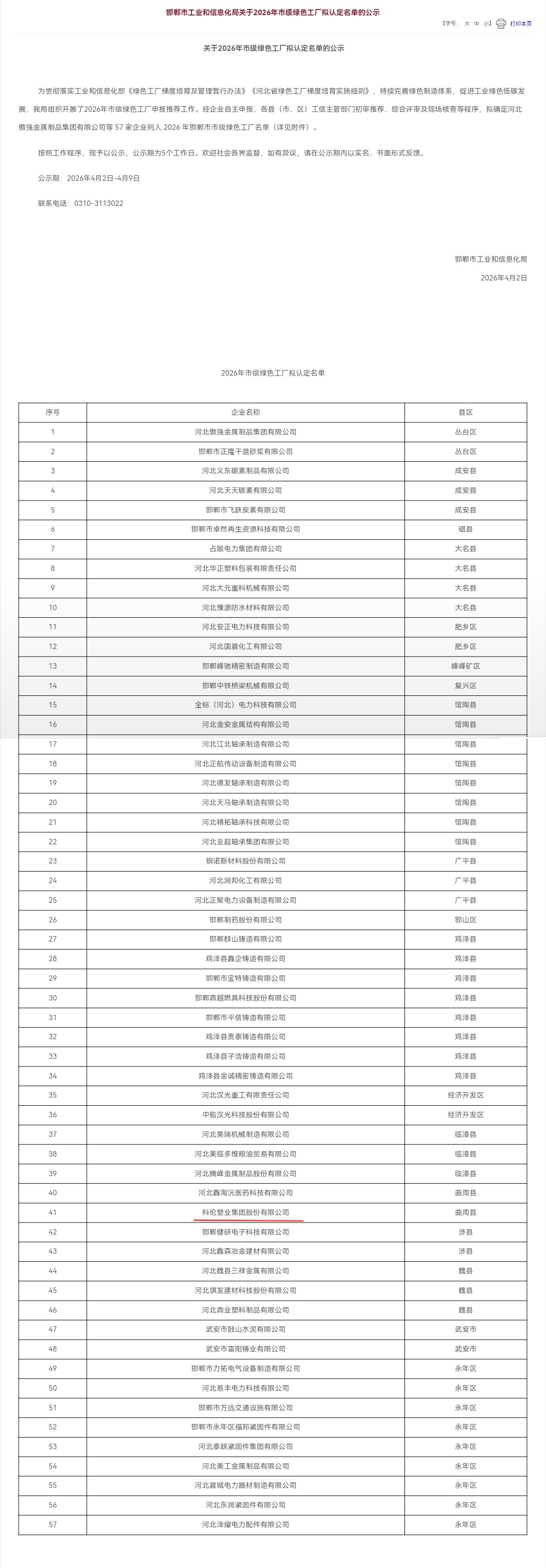 科倫塑業(yè)集團成功入選2026年邯鄲市市級綠色工廠擬認定名單